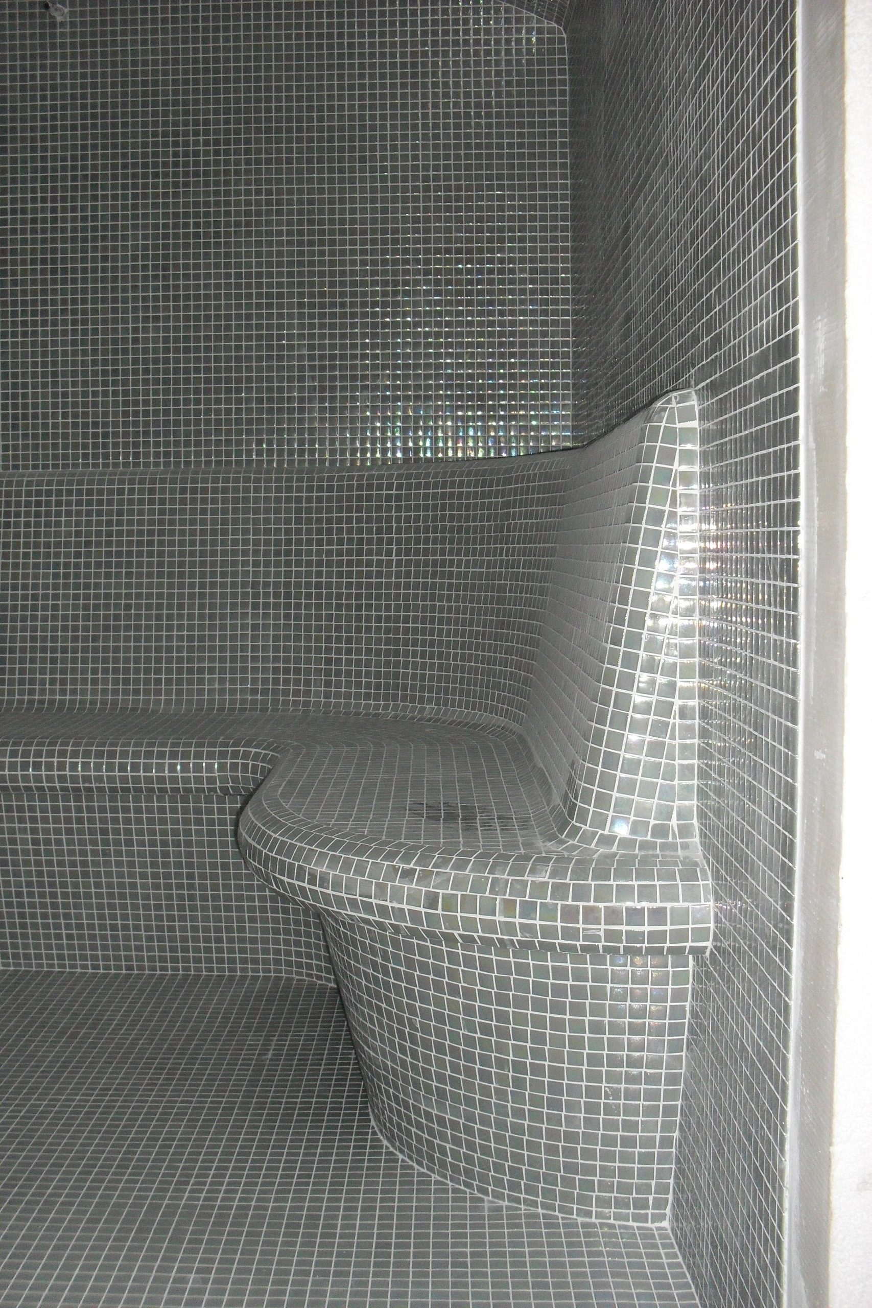 Localização: Hotel Faro, Algarve; Projeto: Construção de Banho Turco (hammam) com assentos ergonómicos; Revestimento: Pastilha Hisbalit Unicolor 317; Acabamento técnico: Massa de junta Mapei 111.