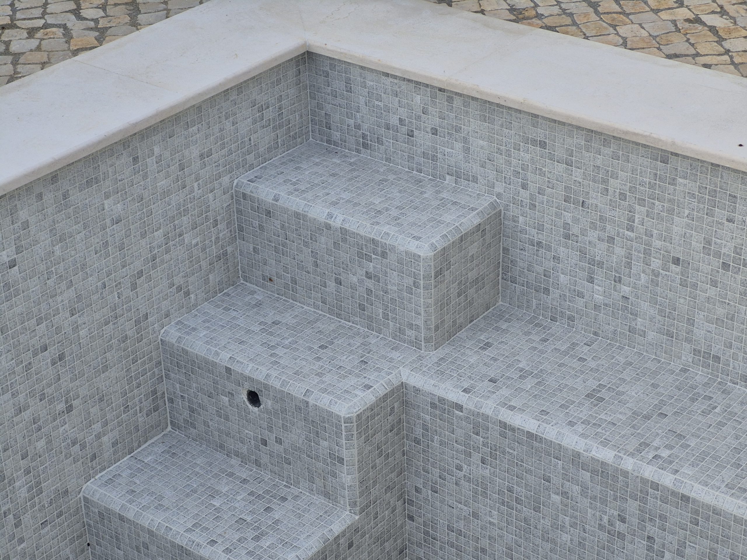 Escadaria de piscina em Cascais: pastilha Hisbalit (Bali) e betume epóxi Mapei com alinhamento de alta precisão.